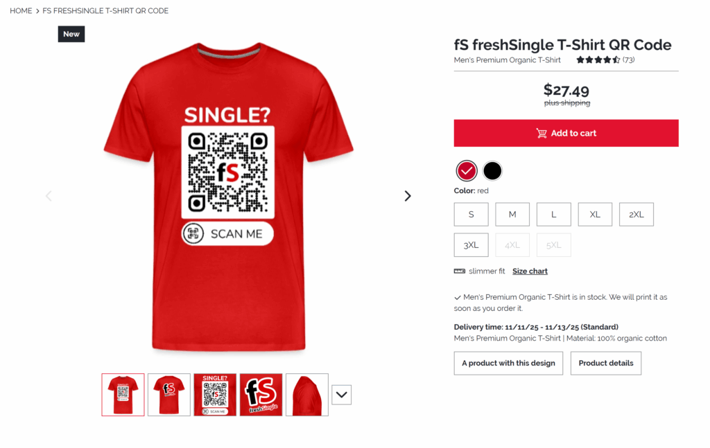 If you’re the one wearing the shirt it works from both angles. People can approach you in the moment, or they can scan the QR code and reach out later via freshSingle. That second option is a gift to shy singles who freeze in real time but feel more confident writing a thoughtful message after the fact. It also opens a door to conversations that might not happen otherwise — like the person who saw you on the train or at a concert and didn’t want to interrupt.